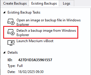 To unmount the image using Macrium Reflect, select the 'Existing Backups' tab, then select 'Detach a backup image from Windows Explorer'.