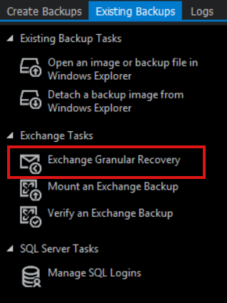 To perform a granular recovery of an email, select the 'Existing Backups' tab in Macrium Reflect Server Plus, the select 'Exchange Granular Recovery' under the 'Exchange Tasks' tab: