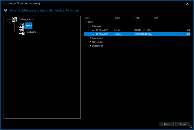 This will open the 'Exchange Granular Recovery' wizard. In this window, select the required database and backup that the email will be recovered from, then click 'Select':