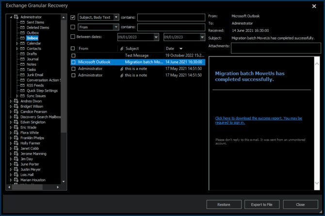 In Macrium Reflect Server Plus, granular recovery can be used to restore individual emails from a backup of Microsoft Exchange. This is useful if a backup contains some vital emails or attachments, that need to be recovered without restoring the whole Microsoft Exchange database to an earlier point in time. This enables emails, appointments, contacts, journal entries, notes, and tasks to be restored.