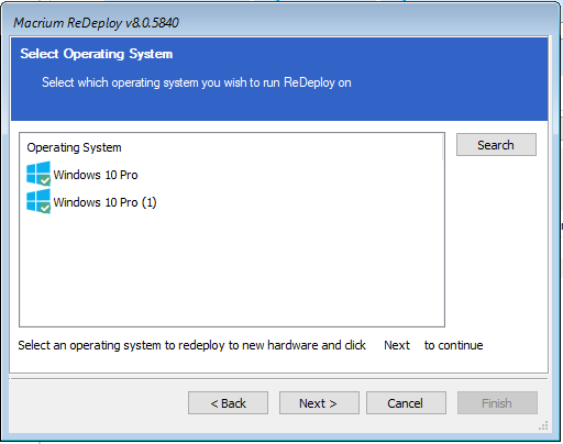 The first page of the ReDeploy wizard will display the operating systems that have been found on the system. In the majority of use cases (single boot systems), only one operating system will be shown in the list. However, in multi-boot systems, multiple operating systems may be present, this page can be used to select the operating system that ReDeploy will run on: