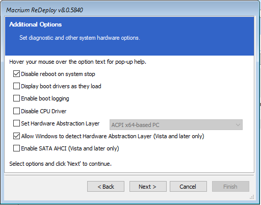 The final page of the ReDeploy wizard contains additional options. Where possible, it is recommended that these options are left as default, unless troubleshooting particular boot issues or as directed by the Macrium Support Team: