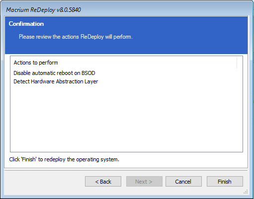 A final confirmation page will then be displayed, click 'Finish' to run ReDeploy: