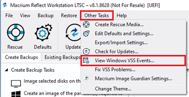 To easily view VSS events in the Windows Event Viewer, select the 'Other Tasks' dropdown menu in Macrium Reflect, then select 'View Windows VSS Events...':