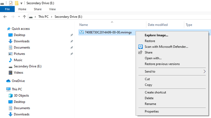 Often, the easiest way to browse a Macrium Reflect image file is directly within Windows Explorer using Macrium Reflect's shell extensions. First, navigate to where the Macrium Reflect image file is located, this can be a local drive or a network share. Right-click on the image and then select 'Explore Image...':