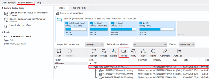 Macrium viBoot can also be launched on the 'Existing Backups' tab of Macrium Reflect. To do this, select a bootable image file on the 'Existing Backups' tab of Macrium Reflect, then select the 'viBoot' icon on the action bar:
