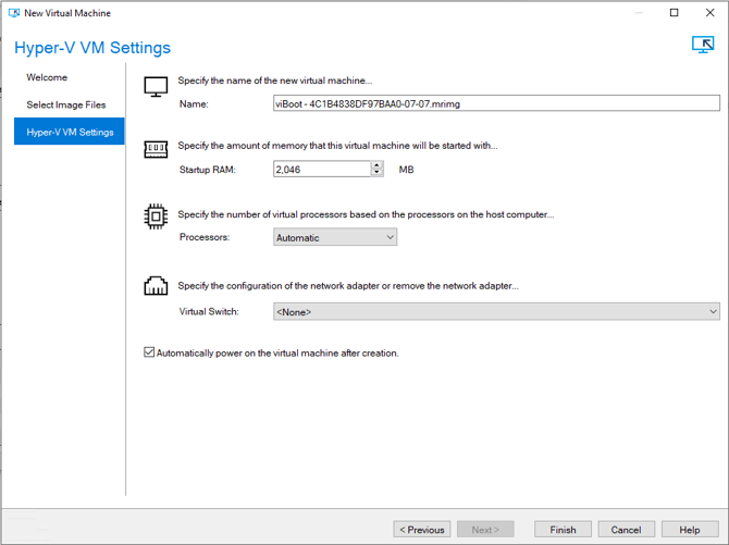 Setting the 'Virtual Switch' to '<None>' will ensure that the virtual machine is not able to connect to a network; this can be especially useful if the system where the image, that is being used as the basis for the virtual machine, is still online. Alternatively, this can be set to an existing network adapter to enable the virtual machine to communicate with a network.