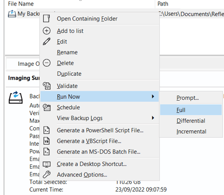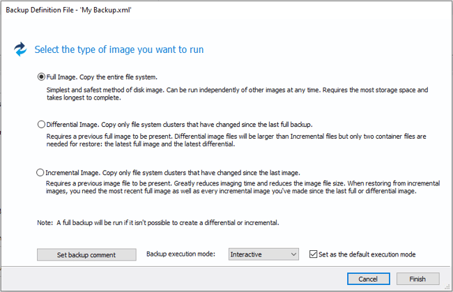 By default, it is set as 'Prompt', which means an option dialog below is prompted whenever users try to run an existing backup definition file via the 'Run Now' option. Changing it to Interactive or Background makes the backup run interactively or in the background without any prompt.