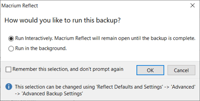 The user can selectively override the option by selecting the 'Prompt' option from the 'Run Now' pop-up menu above. In this case, an option is shown and the user can select whether to run interactively or in the background for once. Selecting 'Set as the default execution mode' will sets the selected option for all the tasks, and will have the same effect as settings in Other Tasks > Edit Defaults and Settings > Advanced Settings > Advanced Backup Settings.
