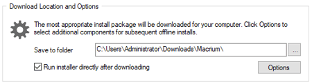 In the Macrium Reflect Download Agent, select ‘Options’ to change the components that will be downloaded.