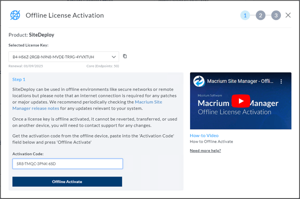 In the window that opens, enter the 'Activation Code' from the offline SiteDeploy server then select ‘Offline Activate’ to offline activate the license.