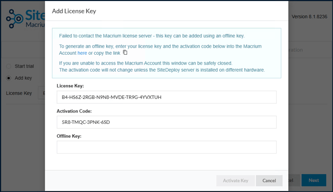 Enter the offline key into the offline SiteDeploy server, then select 'Activate Key' to complete the offline license activation.