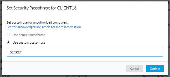 To set the passphrase, select the computers by checking the appropriate box in the computers list and press the 'Set Passphrase' button in the 'More Actions' dropdown. This will open the passphrase editing dialog: