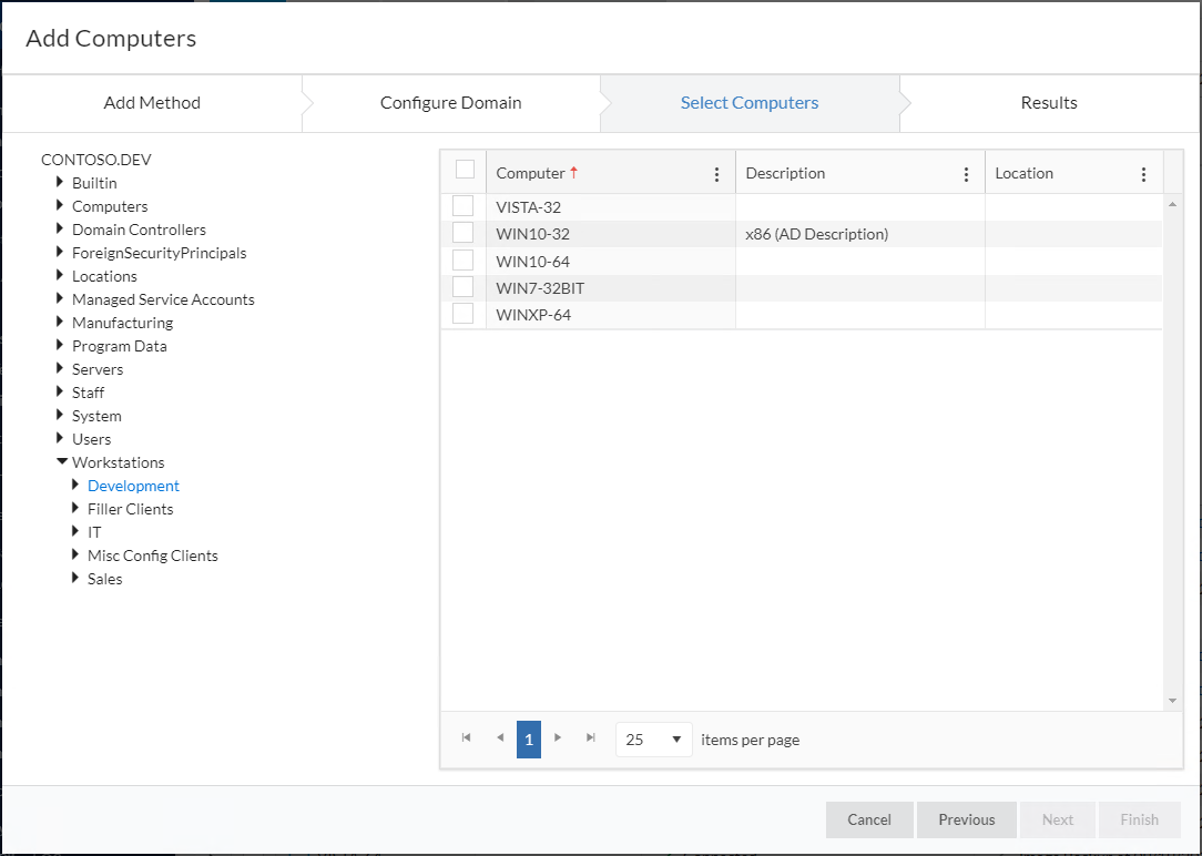 The tree view on the left side of the page can be used to navigate around the domain organizational units. Selecting an organizational unit will display the member computers in the table. The checkbox next to each system, or at the top of the column, can be used to select individual systems or all systems that are part of that organizational unit: