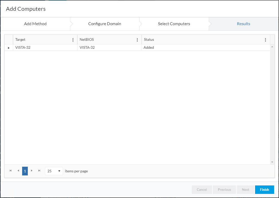 The table on the 'Results' page shows the sucess of the name resolution. Agents with resolved NetBIOS names are added to SiteBackup. Unsuccessful IP address lookups will also be reported.