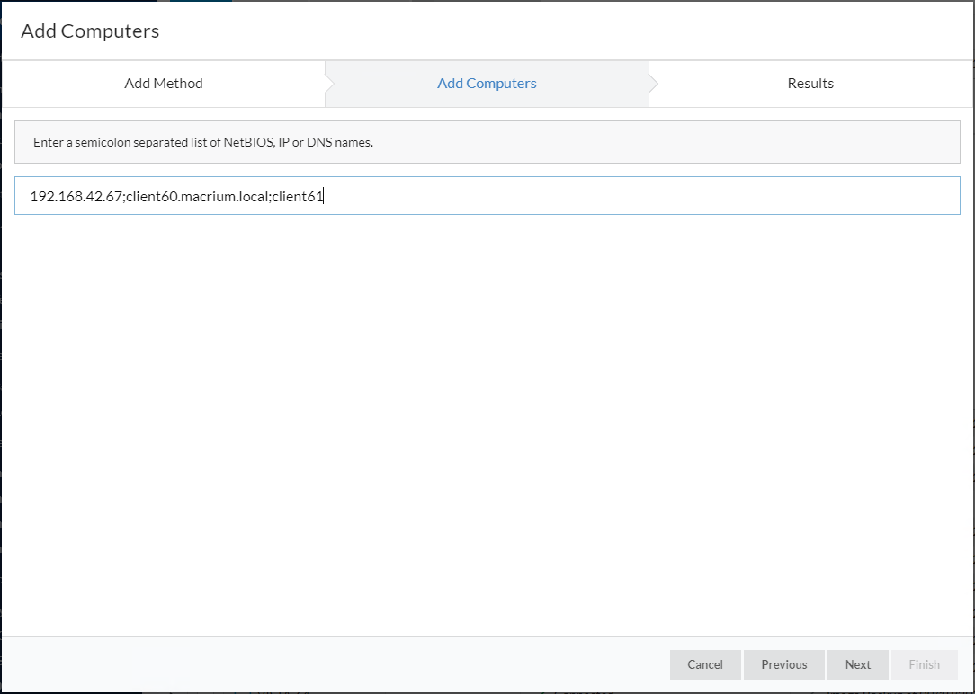 Computers can be added to SiteBackup manually if the user knows the NetBIOS, DNS name, or the IPv4 or IPv6 IP address of the target computer. DNS names and IP addresses will be resolved to a NetBIOS name by SiteBackup. Multiple computers can be added using a semicolon (;) separated list, whitespaces are ignored in this list:
