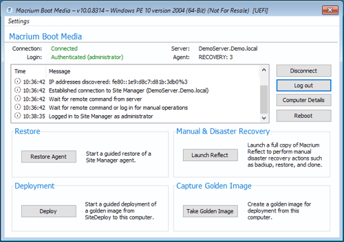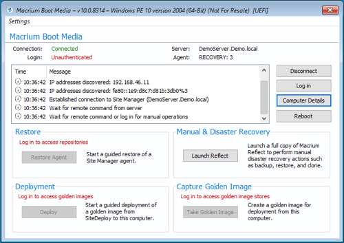 Once the deployment media has been booted, the Macrium PE Agent will be displayed. The ‘Capture Golden Image’ option will be disabled until the PE Agent has logged in to the SiteDeploy server, enabling access to the golden image stores.