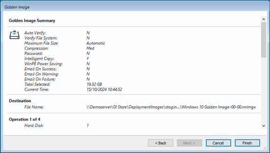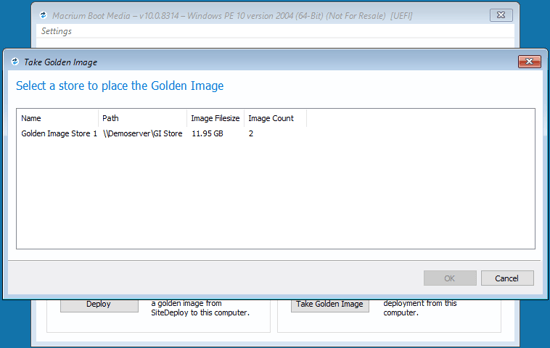 Selecting ‘Take Golden Image’ opens the Take Golden Image wizard and shows the golden image stores that have been created in SiteDeploy.