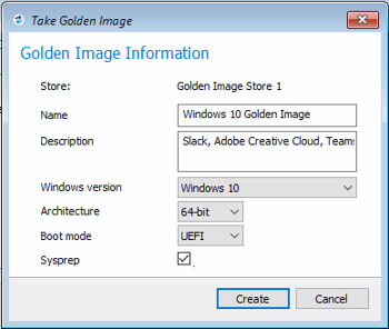 In the window that opens, enter a name and, optionally, a description for the golden image; this name and description will be used to distinguish the golden images in the future. If the computer has been Sysprepped, the 'Sysprep' checkbox will be checked already.