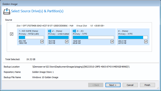 Next, select the partitions from the reference computer that will be included in the golden image. It is recommended that all system partitions are included in the golden image, as they will be required to boot Windows on the target endpoint after the golden image has been deployed. System partitions are denoted by the Windows icon shown on the partition: