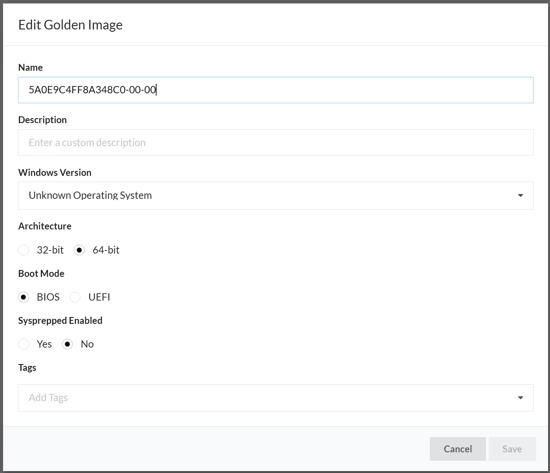 Once the image has been imported, it will be available in the 'Golden Images' tab. The image may have incorrect information and tags regarding the operating system that is contained in the golden image: