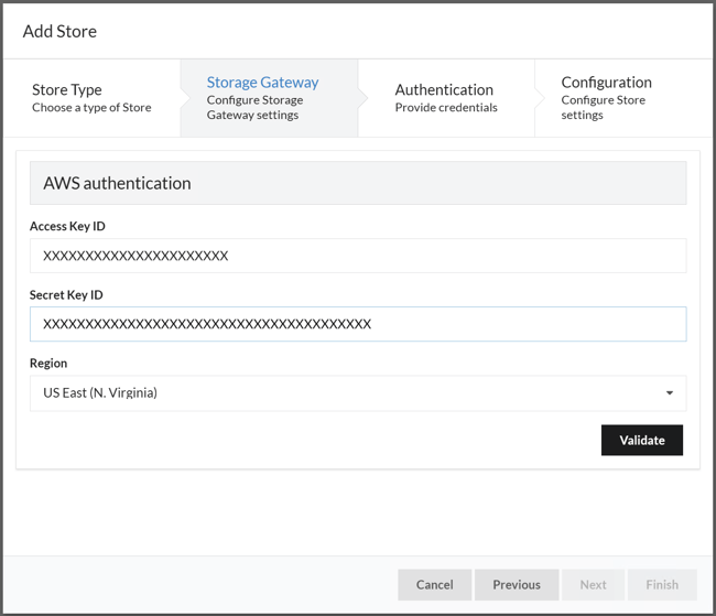 Once the Access Key ID and Secret Key ID of the Storage Gateway have been entered, press 'Validate' to get a list of gateway names and volumes to select.
