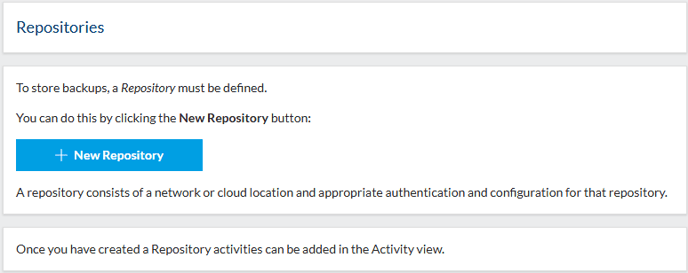 Repositories are created and managed on the 'Repositories' page of SiteBackup. If there are no existing repositories, a quick help page is shown instead: