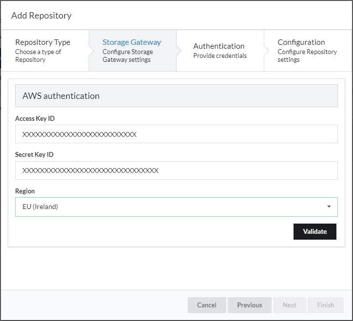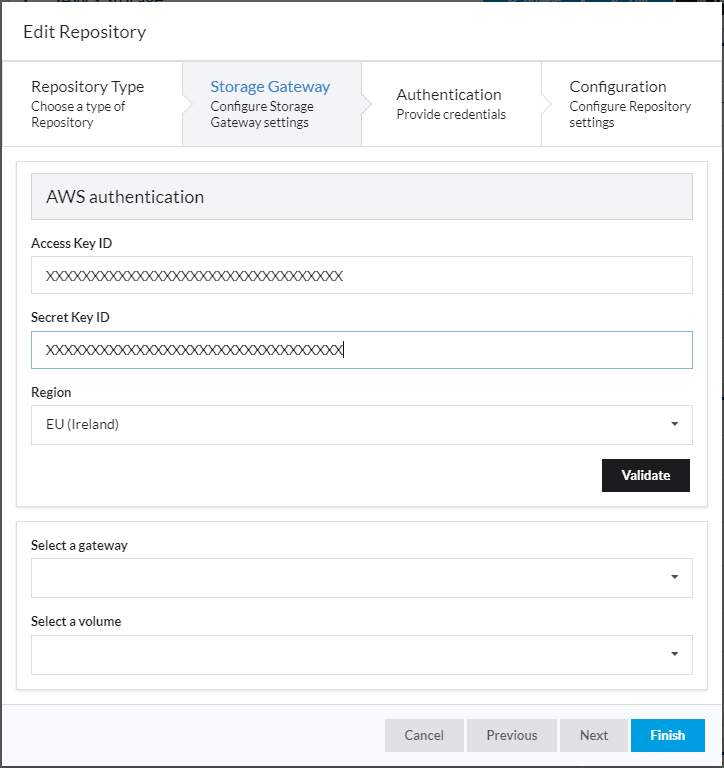 Once the 'Access Key ID' and 'Secret Key ID' of the Storage Gateway have been entered, press 'Validate' to get a list of gateway names and volumes to select.