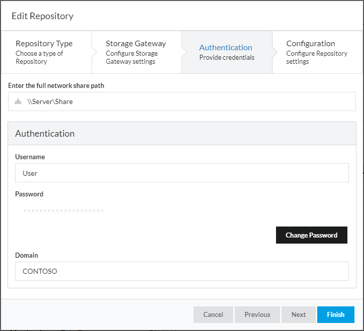 Information required to access the network share is specified on the second page of the wizard, including the UNC path to where the share is located, and credentials that will be used by the SiteBackup Agents to access the repository. The share entered must be mapped to the AWS Storage Gateway volume selected. The available options are as follows: