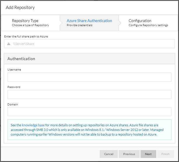 Azure shares use the SMB version 3.0 protocol. This requires that the computer accessing the share is running a version of Windows which supports this on both the Site Manager server and each managed computer that backs up to the repository. Versions of Windows which support SMB 3.0 are: