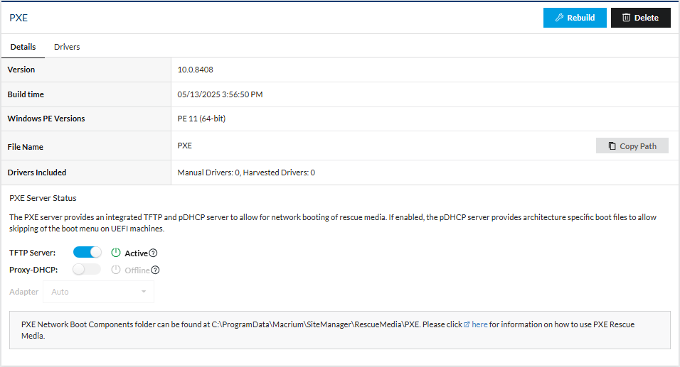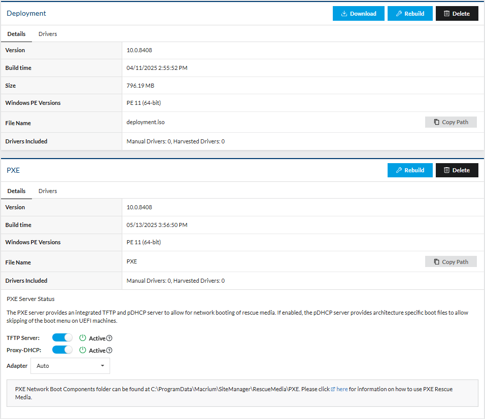 Once the deployment media has been created, it can be viewed under the 'Deployment' and 'PXE' headings. Deployment ISOs can be downloaded to the computer that is accessing the SiteManager Platform using the ‘Download’ button and PXE components can be found at the default path of C:\ProgramData\Macrium\SiteManager\RescueMedia\PXE.