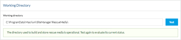 The default location for the deployment media creation can be changed using the 'Working Directory' option on the 'Rescue Media' page of the SiteManager Platform settings.
