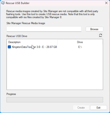 Alternatively, the Rescue USB Builder can be launched with a GUI. A list of available USB devices will be shown that can be used for the deployment media creation: