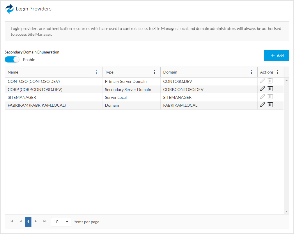 Login providers serve as the interface between SiteManager Platform and an authentication resource. There is a unique login provider for each authentication resource so that permissions for each resource can be managed independently by configuring the associated provider. The types of login providers are:
