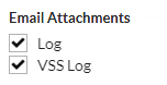 Additionally, there are options to set whether the associated log and VSS log should be attached as an email attachment: