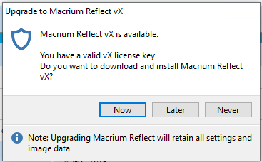 Standalone subscription licenses are always eligible for an upgrade to Macrium Reflect X. This upgrade can be claimed using Standalone Macrium Reflect that is installed on the managed SiteBackup Agent computer. The first time that Standalone Macrium Reflect is launched, you will be prompted to perform the upgrade: