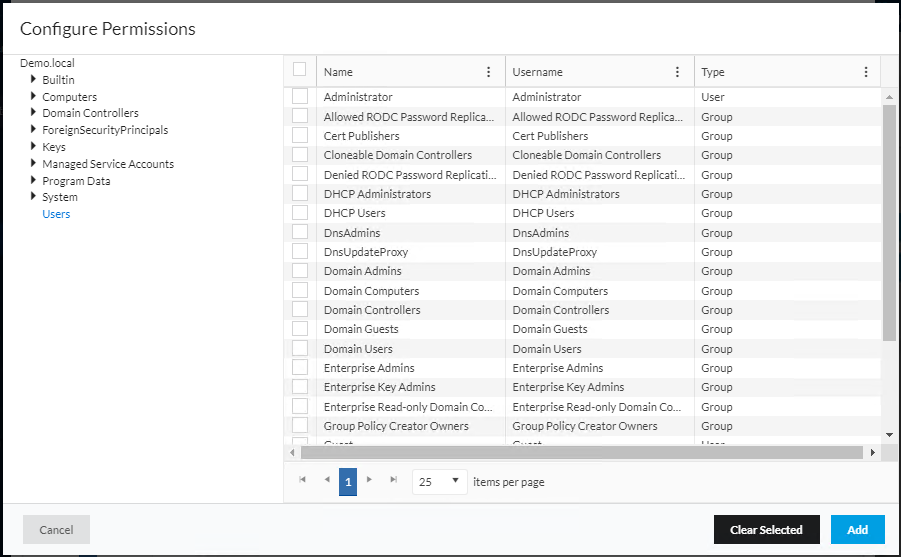 The structure of the directory is navigable through the tree on the left, which shows the folders and organizational units that have been configured on the domain or local computer. On the right is a table listing the users and groups in the selected folder. Rows can be selected using the checkbox and added to the permissions list when the 'Add' button is pressed.