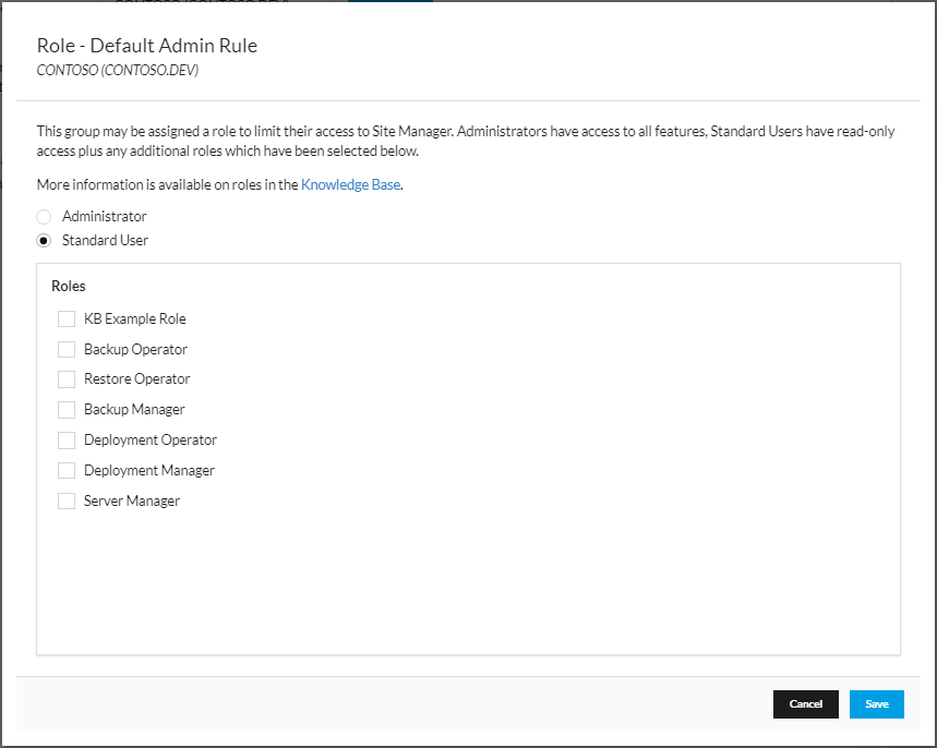 In the window that opens, the custom and pre-defined roles, described above, will be displayed. Select any combination of roles to control how much access the selected user or group will have: