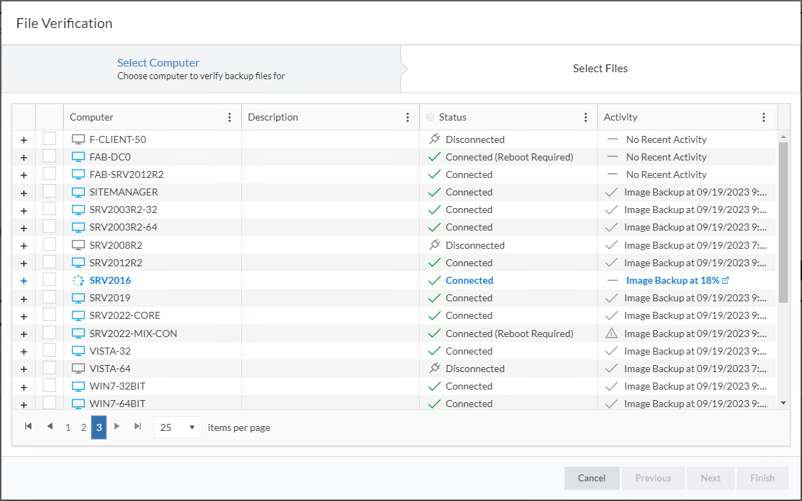 The 'Select Files' page of the wizard will then display backups of the selected computer. Select the backup file(s) that will be verified, multiple backups can be selected. If multiple backup files are selected, the verification will start for one of the backups, the other backups will be queued and verification will start when the in-progress verification has completed.